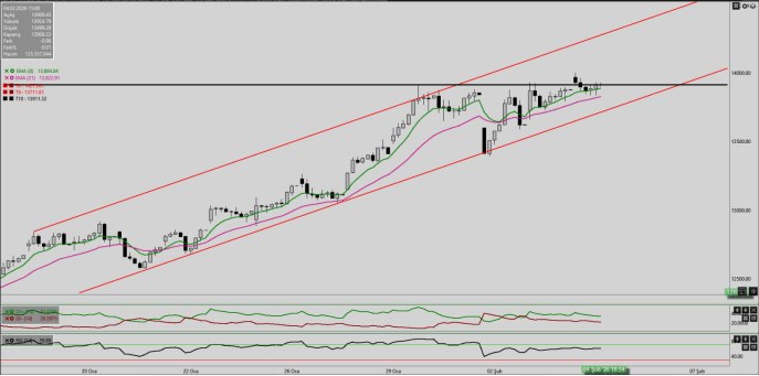 13991 TL daha önce aşılarak 13.998 TL test edilse de, 14.000 TL seviyesine yakın bölgede psikolojik direnç kaynaklı satış baskısının devreye girdiği görüldü. Geri çekilmelerde Ema 8 ve Ema 21 seviyelerinden destek bulan endeks, mevcut saatlerde yeniden 13.991 TL seviyesini aşma çabasında.