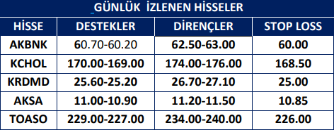 AKBNK: Fiyatın önemli destek/direnç dönüşüm noktası üzerinde olduğunu düşünmekteyiz. 59.70 seviyesi üzerinde fiyat hareketinin yukarı yönlü devam edebileceğini ön görmekteyiz. Yukarıda sırasıyla 62.10 ve 63.95 seviyelerini hedef olarak takip etmekteyiz.