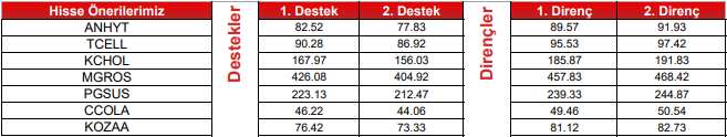 MAVI : 39.44 – 39.74 yatay destek bölgesi üzerinde yukarı yönlü hareketlerin devam edebileceğini düşünüyoruz. Yukarıda 42.00 seviyesini ve 43.00 – 43.30 yatay direnç bölgesini takip etmekteyiz.