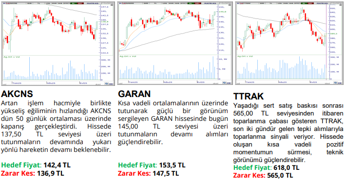 GARAN : Ara yatay destek bölgesi olan 144 – 145 bölgesi üzerinde yukarıdaki hedeflerine gidebileceğini düşünüyoruz. Yukarıda sırasıyla 154.5 seviyesi ve bu seviye üzerinde sağlayabileceği kalıcılık ile 161 – 163.7 bölgesini takip etmekteyiz.