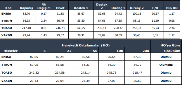 HALKB: Takip ettiğimiz önemli destek bölgesi üzerinde kapanış yaptığını görmekteyiz. 34.64 seviyesi üzerinde yukarı yönlü fiyat hareketlerinin olası olabileceğini düşünmekteyiz. Olası geri çekilmelerde 35.12 seviyesini ara destek olarak takip etmekteyiz. Yukarıda 36.00 – 36.60 ve 37.26 seviyelerini sıralı hedefler olarak takip etmekteyiz.