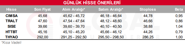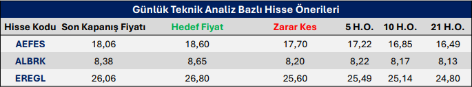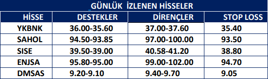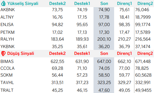 ALARK : Takip ettiğimiz önemli destek bölgesi üzerinde kapanış yaptığını görmekteyiz. 103.80 seviyesi üzerinde yukarı yönlü fiyat hareketlerinin olası olabileceğini düşünmekteyiz. Olası geri çekilmelerde 104.80 seviyesini ara destek olarak takip etmekteyiz. Yukarıda 107.80 ve 110.80 seviyelerini sıralı hedefler olarak takip etmekteyiz.