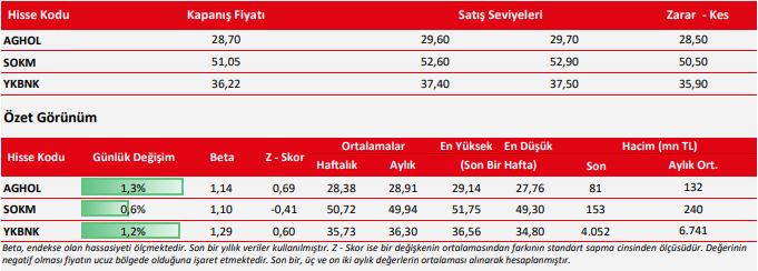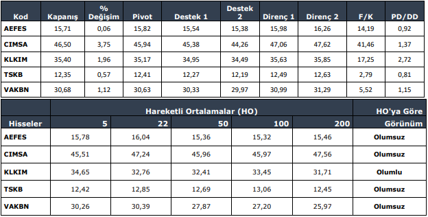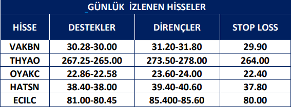 VAKBN: Takip ettiğimiz önemli destek bölgesi üzerinde kapanış yaptığını görmekteyiz. 30.32 seviyesi üzerinde yukarı yönlü fiyat hareketlerinin olası olabileceğini düşünmekteyiz. Olası geri çekilmelerde 30.50 seviyesini ara destek olarak takip etmekteyiz. Yukarıda 31.16 ve 31.64 seviyelerini sıralı hedefler olarak takip etmekteyiz.
