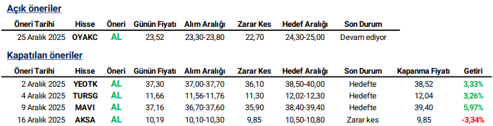 OYAKC : Takip ettiğimiz önemli destek bölgesi üzerinde kapanış yaptığını görmekteyiz. 23.16 seviyesi üzerinde yukarı yönlü fiyat hareketlerinin olası olabileceğini düşünmekteyiz. Olası geri çekilmelerde 23.38 seviyesini ara destek olarak takip etmekteyiz. Yukarıda 23.90 ve 24.20 seviyelerini sıralı hedefler olarak takip etmekteyiz.