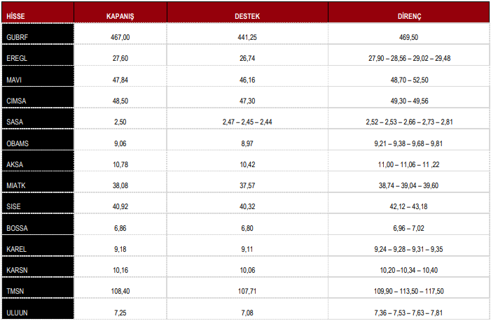EREGL: Takip ettiğimiz önemli destek bölgesi üzerinde kapanış yaptığını görmekteyiz. 27.14 seviyesi üzerinde yukarı yönlü fiyat hareketlerinin olası olabileceğini düşünmekteyiz. Olası geri çekilmelerde 27.38 seviyesini ara destek olarak takip etmekteyiz. Yukarıda 28.18 ve 28.84 seviyelerini hedef olarak takip etmekteyiz.