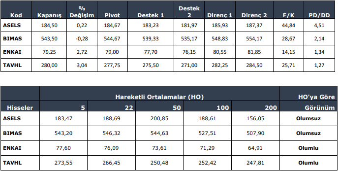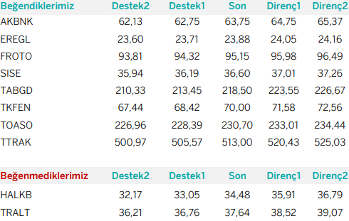 TUPRS : Takip ettiğimiz önemli destek bölgesi üzerinde kapanış yaptığını görmekteyiz. 191.5 seviyesi üzerinde yukarı yönlü fiyat hareketlerinin olası olabileceğini düşünmekteyiz. Olası geri çekilmelerde 193.0 seviyesini ara destek olarak takip etmekteyiz. Yukarıda 198.1 ve 201.6 seviyelerini hedef olarak takip etmekteyiz.