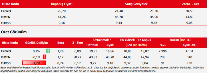 EKGYO : Mikro yükseliş trendi desteği ve 20.40 – 20.50 yatay destek bölgesi kesişimi üzerinde fiyatlandığını görüyoruz. Bu kesişim bölgesi üzerinde fiyat hareketinin yukarı yönlü devam edebilme potansiyeline sahip olduğunu düşünüyoruz. Yukarıda sırasıyla 21.00 – 21.42 ve 21.78 seviyelerini takip etmekteyiz.