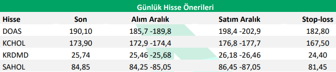 DOAS : Takip ettiğimiz önemli destek bölgesi üzerinde kapanış yaptığını görmekteyiz. 186.80 seviyesi üzerinde yukarı yönlü fiyat hareketlerinin olası olabileceğini düşünmekteyiz. Olası geri çekilmelerde 189.10 seviyesini ara destek olarak takip etmekteyiz. Yukarıda 194.00 ve 196.20 seviyelerini sıralı hedefler olarak takip etmekteyiz.