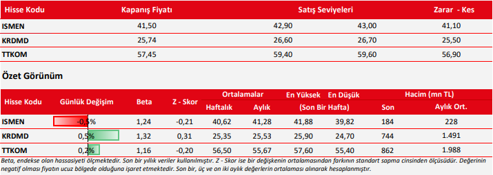 TTKOM : Takip ettiğimiz önemli destek bölgesi üzerinde kapanış yaptığını görmekteyiz. 56.45 seviyesi üzerinde yukarı yönlü fiyat hareketlerinin olası olabileceğini düşünmekteyiz. Olası geri çekilmelerde 56.80 seviyesini ara destek olarak takip etmekteyiz. Yukarıda 58.65 ve 59.15 seviyelerini sıralı hedefler olarak takip etmekteyiz.