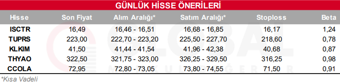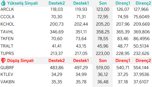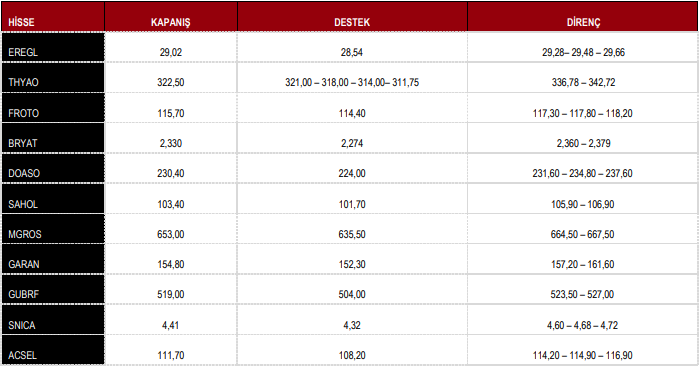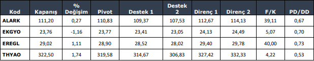 KCHOL : Takip ettiğimiz önemli destek bölgesi üzerinde kapanış yaptığını görmekteyiz. 201.80 seviyesi üzerinde yukarı yönlü fiyat hareketlerinin olası olabileceğini düşünmekteyiz. Olası geri çekilmelerde 204.10 seviyesini ara destek olarak takip etmekteyiz. Yukarıda 208.80 ve 214.00 seviyelerini sıralı hedefler olarak takip etmekteyiz.