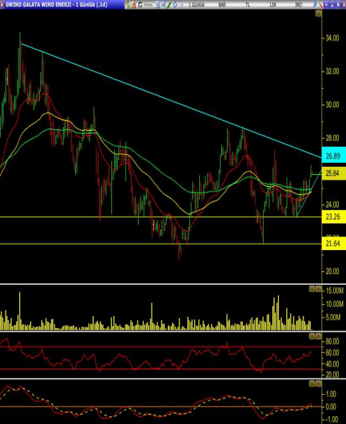• Düşen trend çizgisi yaklaşık 27 TL civarında güçlü direnç bölgesini temsil ediyor. Son dönemde de hisse bu trende doğru bir atak yapmış.