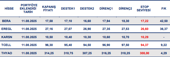Kısa vadeli öneri listemize BERA, EREGL, KARSN, TCELL ve THYAO pay senetlerini dahil ediyoruz.