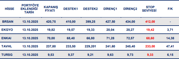 Kısa vadeli öneri listemize BRSAN, EKGYO, ENKAI, TAVHL ve TURSG pay senetlerini dahil ediyoruz.