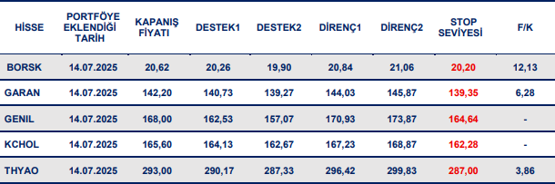 Kısa vadeli öneri listemize BORSK, GARAN, GENIL, KCHOL ve THYAO pay senetlerini dahil ediyoruz.