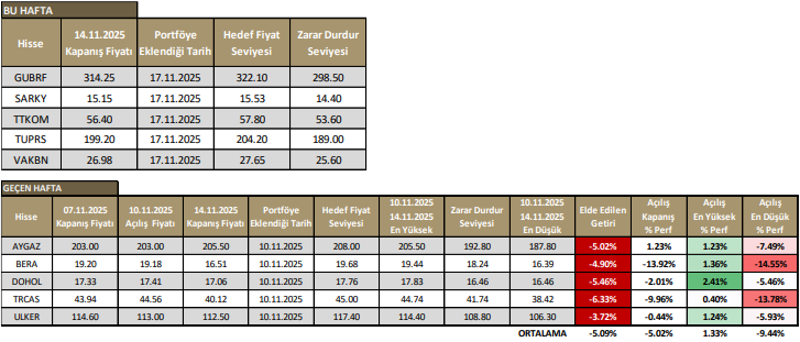 10 Kasım – 14 Kasım 2025 haftasında model portföyde yer alan AYGAZ, BERA, DOHOL, TRCAS ve ULKER haftayı negatif getiriyle tamamladı. TRCAS haftayı %6.03 düşüşle tamamlayarak portföyde haftanın en zayıf performansını sergiledi.