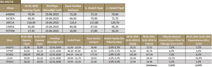 12 Ocak – 16 Ocak 2026 haftasında model portföyde yer alan hisselerimizin tamamı haftayı pozitif getiriyle tamamladı. Bu dönemde Bist-100 endeksi %3,83 değer kazanırken, model portföyün aynı periyottaki getirisi %6,03 olmuştur. 19 Ocak – 23 Ocak haftasında geçerli model portföyümüzde ise AKBNK, AKSEN, ARCLK, CIMSA ve PETKM hisselerine yer veriyoruz.