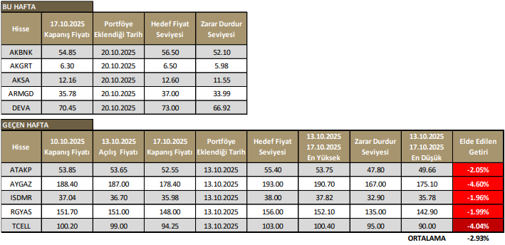 13 Ekim – 17 Ekim 2025 haftasında model portföyde yer alan ATAKP, AYGAZ, ISDMR, RGYAS ve TCELL haftayı negatif getiriyle tamamladı. AYGAZ haftayı %4.60 düşüşle tamamlayarak portföyde haftanın en zayıf performansını sergiledi.