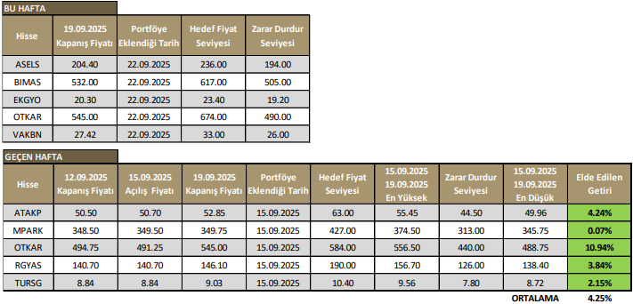 15 – 19 Eylül 2025 haftasında model portföyde yer alan ATAKP, MPARK, OTKAR, RGYAS ve TURSG hisseleri haftayı pozitif getiriyle tamamladı. OTKAR haftayı %10.94 yükselişle kapatarak portföy performansına güçlü katkı verirken, MPARK haftayı daha sınırlı bir getiriyle tamamladı.