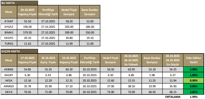 20 Ekim – 24 Ekim 2025 haftasında model portföyde yer alan AKBNK, AKGRT, AKSA, ARMGD ve DEVA haftayı pozitif getiriyle tamamladı. Hafta içerisinde AKBNK, AKGRT, ARMGD ve DEVA hisseleri belirlenen hedef fiyat seviyelerine ulaştı.