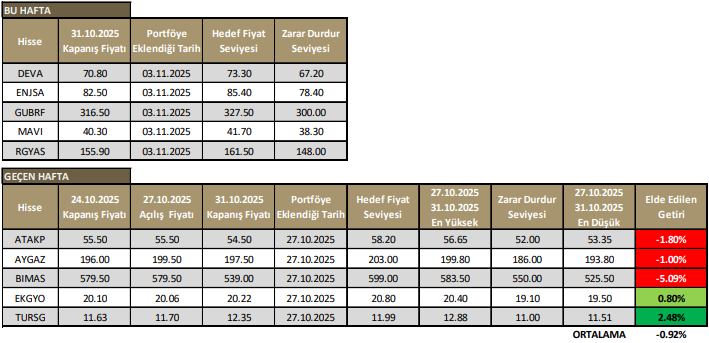 27 Ekim – 31 Ekim 2025 haftasında model portföyde yer alan EKGYO ve TURSG haftayı pozitif getiriyle tamamladı. TURSG haftayı %2.48 yükselişle kapatarak portföy performansına katkı verirken, BIMAS haftayı %5.09 düşüşle tamamladı.
