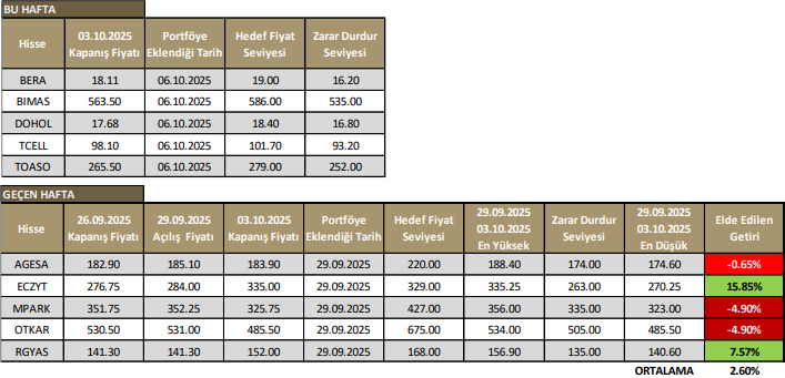 29 Eylül – 3 Ekim 2025 haftasında model portföyde yer alan AGESA, MPARK, OTKAR hisseleri haftayı negatif getiriyle tamamlarken, ECZYT ve RGYAS hisseleri haftayı pozitif getiriyle kapattı.