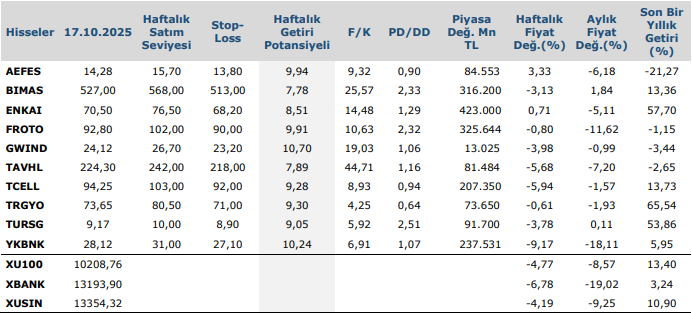 Yurt içinde bu hafta piyasaların odak noktası, Türkiye Cumhuriyet Merkez Bankası’nın (TCMB) Ekim ayı faiz kararı olacak. Para Politikası Kurulu’nun (PPK) toplantısı bu hafta gerçekleştirilecek ve karar metni, ekonomideki yönü belirleyebilecek önemli sinyaller içerecek. Geçtiğimiz ay PPK, politika faizi olan bir hafta vadeli repo ihale faiz oranını 250 baz puan artırmıştı. Bu nedenle gözler şimdi, Ekim 2025 toplantısında alınacak olası faiz adımına çevrilmiş durumda. TCMB Başkanı Fatih Karahan liderliğinde toplanacak Kurul’un, mevcut sıkı para politikası duruşunu nasıl güncelleyeceği merak ediliyor. TCMB’nin resmi takvimine göre faiz kararı 23 Ekim Perşembe günü saat 14.00’te kamuoyuyla paylaşılacak. Açıklanacak karar, hem enflasyon beklentileri hem de kur ve faiz piyasalarının yönü açısından yakından takip edilecek. Yurtiçinde bu hafta şirketler 2025 3.çeyreğe ilişkin finansal tablolarını paylaşmaya başlayacak. 20 Ekimde TURSG, 23 Ekimde AKBNK, EBEBK, TATGD, TAVHL, 24 Ekimde ise ARCLK ve LILAK finansal tablolarını yayınlayacak. Konsolide olmayan tablolar için son bilanço yayınlama tarihi 30 Ekim, konsolide olan tablolar için 10 kasım olarak açıklandı. Bankalar için ise finansal tablolarını yayınlamaları için son tarih 14 Kasım olarak belirtildi.