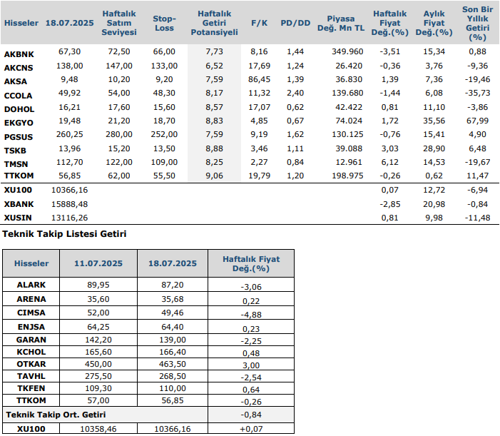 ABD’de geçtiğimiz hafta öne çıkan başlıklar arasında ticaret politikaları, şirket bilançoları ve enflasyon verileri yer aldı. ABD yönetimi, Nvidia gibi şirketlerin belirli yapay zekâ çiplerini Çin’e yeniden ihraç edebilmesine olanak tanıyacak şekilde ihracat kısıtlamalarını gevşetmeyi planladığını açıkladı. Bunun yanında Vietnam, Endonezya ve Hindistan gibi ülkelerle yürütülen ticaret görüşmeleri, tedarik zincirlerini Çin dışına kaydırma stratejisinin bir parçası olarak dikkat çekti. Ancak genel olarak, ABD’nin küresel ticaret ortaklarına uyguladığı 10-35% arası tarifelerle birlikte, ortalama ithalat vergisi oranı 1910’dan bu yana en yüksek seviyeye çıktı. Ticaretteki bu belirsizlik, yatırımcıların risk iştahını sınırlamaya devam etti. Öte yandan, ikinci çeyrek bilançoları güçlü bir başlangıç yaptı; açıklanan şirketlerin %86’sı beklentileri aşarken, özellikle finans sektörü olumlu ayrıştı. ABD’de açıklanan Haziran ayı TÜFE verisi ise yıllık bazda %2,7 ile beklentilere paralel geldi ve enflasyonun bazı kalemlerde yukarı yönlü baskı yaratmaya devam ettiğini gösterdi. Genel olarak, hem makroekonomik veriler hem de şirket kârları piyasaları desteklerken, ticaret politikaları belirsizlik yaratmaya devam ediyor.