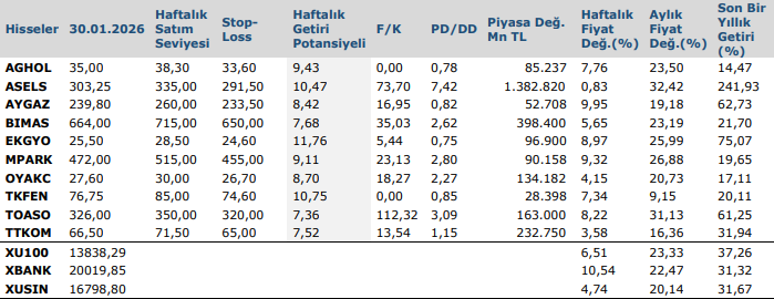 Yurt içinde geçtiğimiz hafta gelen haberlerin etkisiyle piyasalar genel olarak pozitif yönde hareket etti. Bloomberg’in haberine göre ABD merkezli fon yönetim şirketi BlackRock, enflasyondaki yavaşlama ve cazip değerlemeleri gerekçe göstererek Türkiye’nin portföy ağırlığını %10 seviyesine çıkararak ülkeyi en büyük üçüncü yatırım destinasyonu haline getirdi. Fon yöneticileri, Türk bankalarının küresel ölçekte ucuz kaldığını ve kredi notu görünümündeki iyileşmeyle birlikte Borsa İstanbul’un dolar bazında gelişmekte olan ülke piyasalarının üzerinde performans sergilediğini vurguladı. Söz konusu haber, yabancı yatırımcı ilgisinin kalıcı biçimde artabileceğine yönelik beklentileri güçlendirerek endeksteki yükselişi destekledi. Makro veri tarafında, Ocak ayına ilişkin Ekonomik Güven Endeksi 99,4 seviyesinde yatay seyrini korurken, ekonomik aktiviteye ilişkin beklentilerin dengeli bir görünüm sunduğu izlendi. Aralık ayı iş gücü verileri ise daha olumlu bir tabloya işaret etti. İşsizlik oranı %8,5’ten %7,7’ye gerileyerek istihdam piyasasında toparlanmanın güçlendiğini gösterdi. TCMB tarafından açıklanan haftalık menkul kıymet istatistiklerine göre ise yurt dışı yerleşikler 19–23 Ocak haftasında hisse senetlerinde 490,6 milyon USD net alım gerçekleştirerek son sekiz haftadır alıcı konumlarını sürdürdü; DİBS ve ÖST tarafındaki güçlü girişlerle birlikte toplam portföy girişinin 2,1 milyar USD’ye ulaşması yabancı ilgisinin genele yayıldığını gösterdi. Sektörel güven endekslerinde hizmet sektörü güveni artışını sürdürürken, perakende ticarette zayıflama, inşaat sektöründe ise önceki aya kıyasla sınırlı bir toparlanma dikkat çekti. Bu görünüm, 2026 yılı başında ekonomik aktivitenin sektörler arasında ayrışarak ilerlediğine işaret etti.