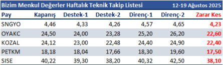 12-19 Ağustos 2025 dönemi için teknik takip listemizde SNGYO, OYAKC, KOZAL, PETKM ve SISE yer almaktadır.