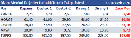 13-20 Ocak 2026 dönemi için teknik takip listemizde YUNSA, HOROZ, CWENE, AKSA ve TUPRS yer almaktadır.