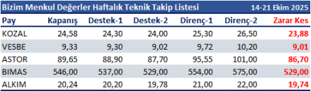 14-21 Ekim 2025 dönemi için teknik takip listemizde KOZAL, VESBE, ASTOR, BIMAS ve ALKIM yer almaktadır.