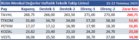 15-22 Temmuz 2025 dönemi için teknik takip listemizde TAVHL, TTKOM, PETKM, KOZAL ve VESTL yer almaktadır.