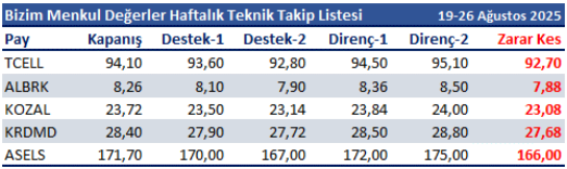 19-26 Ağustos 2025 dönemi için teknik takip listemizde TCELL, ALBRK, KOZAL, KRDMD ve ASELS yer almaktadır.
