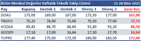 21-28 Ekim 2025 dönemi için teknik takip listemizde DOAS, TRGYO, KOZAA, GOODY ve TUPRS yer almaktadır.