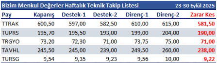 23-30 Eylül 2025 dönemi için teknik takip listemizde TTRAK, TUPRS, TRGYO, TAVHL ve TURSG yer almaktadır.