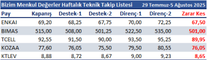 29 Temmuz-5 Ağustos 2025 dönemi için teknik takip listemizde ENKAI, BIMAS, TCELL, KOZAA ve KTLEV yer almaktadır.