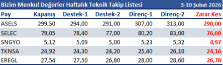 3-10 Şubat 2026 dönemi için teknik takip listemizde ASELS, SELEC, SNGYO, TKNSA ve EREGL yer almaktadır.