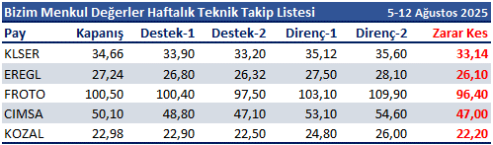 5-12 Ağustos 2025 dönemi için teknik takip listemizde KLSER, EREGL, FROTO, CIMSA ve KOZAL yer almaktadır.