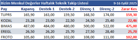 9-16 Eylül 2025 dönemi için teknik takip listemizde TUPRS, KOZAL, BIMAS, EREGL ve FROTO yer almaktadır.