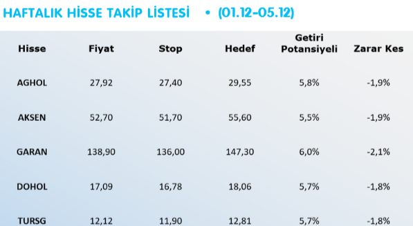 BIST100 endeksi geçtiğimiz haftayı yatay negatif seyirle 10898 puandan tamamladı. Endeksin kasım ayı performansı -0,66% oldu. Endeks kasım ayı ortalama performanslarının gerisinde kaldı. XBANK ise haftayı %5,54, ayı ise %6,4 yükselişle tamamladı. XBANK endeksi enflasyon beklentilerinin belirginleşmesiyle pozitif ayrıştı. Yeni haftada bugün büyüme verisi çarşamba günü ise kasım TÜFE rakamları piyasanın odağında olacak. Zayıf bir enflasyon verisi yıl bitmeden endekse TL bazlı rekor getirebilir.