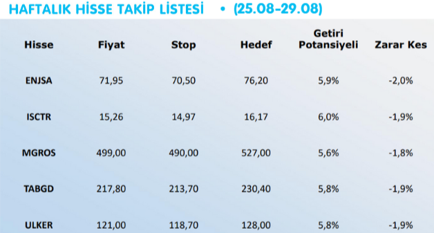 BIST100 endeksi geçtiğimiz haftayı %4,62 yükselişle 11.372 puandan tamamlayarak tarihi zirvesini yeniledi. Sınai hisselerine gelen güçlü alışların ardından son iki gün bankacılık endeksinin de güç kazanması ile yukarı yönlü ivme yeniden tazelendi. Yeni haftada ağustos vadeli endeks kontratların son haftası olması sebebiyle oynaklığın artmasını bekliyoruz. Yurt içinde gündem sakin olurken, ABD’de bu hafta 2Ç25 büyüme verileri takip edilecek. Teknik olarak 11.000 seviyesinin üzerinde hızlı şekilde yeninden ivmelenen endeksin 280 dolar yıl açılış seviyesini test ettiğini takip ettik. 11250 üzerinde kalıcılık devam ettiği sürece yukarı yönde 11600-11750-12000 seviyeleri sıralı hedefler olarak takip edilebilir.