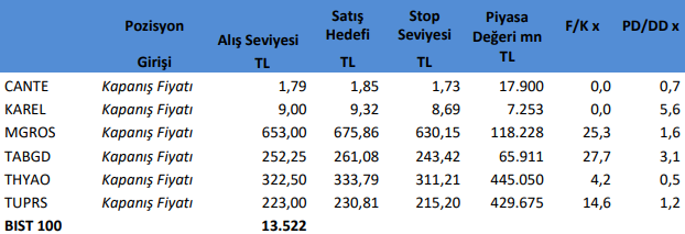 Takibimizdeki hisseler tamamen teknik analize göre belirlenmektedir. İşlem hacmi ve likiditesi yüksek 100 Endeks hisselerinden olmasına öncelik verilmektedir. Pozisyona giriş fiyatları Cuma günü kapanış seansında oluşan fiyatlardan yapılmaktadır. Hedefine ulaşmayan pozisyonlar stop loss seviyesinin altına inmediyse, bir sonraki Cuma günü kapanış fiyatından kapatılmaktadır. Belirlenen stop loss seviyeleri referans stop noktasıdır. Bu stop loss seviyesinin altında bir kapanış olması halinde referans değer gün sonu kapanış olarak alınacaktır.