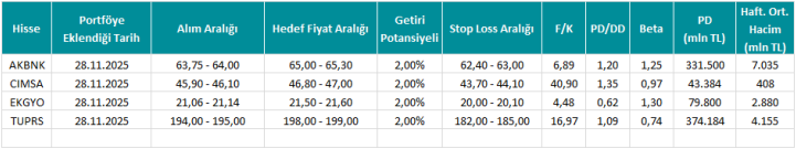 *Tablo yer alan fiyat sütunu verileri ile diğer veriler hisselerin portföye eklendiği tarihten önceki son işlem günü kapanış verileri üzerinden hesaplanmıştır.
