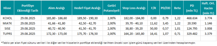*Tablo yer alan fiyat sütunu verileri ile diğer veriler hisselerin portföye eklendiği tarihten önceki son işlem günü kapanış verileri üzerinden hesaplanmıştır.