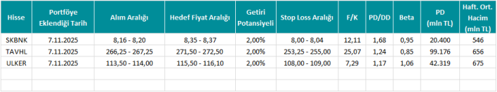 *Tablo yer alan fiyat sütunu verileri ile diğer veriler hisselerin portföye eklendiği tarihten önceki son işlem günü kapanış verileri üzerinden hesaplanmıştır.