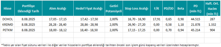 *Tablo yer alan fiyat sütunu verileri ile diğer veriler hisselerin portföye eklendiği tarihten önceki son işlem günü kapanış verileri üzerinden hesaplanmıştır.