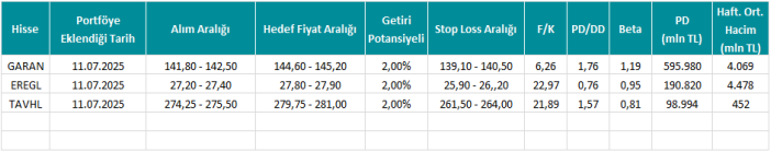 *Tablo yer alan fiyat sütunu verileri ile diğer veriler hisselerin portföye eklendiği tarihten önceki son işlem günü kapanış verileri üzerinden hesaplanmıştır.