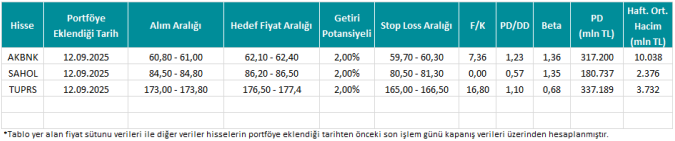 *Tablo yer alan fiyat sütunu verileri ile diğer veriler hisselerin portföye eklendiği tarihten önceki son işlem günü kapanış verileri üzerinden hesaplanmıştır.