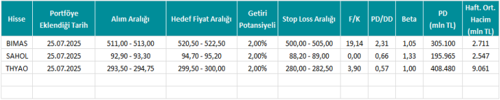 *Tablo yer alan fiyat sütunu verileri ile diğer veriler hisselerin portföye eklendiği tarihten önceki son işlem günü kapanış verileri üzerinden hesaplanmıştır.