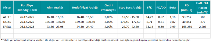*Tablo yer alan fiyat sütunu verileri ile diğer veriler hisselerin portföye eklendiği tarihten önceki son işlem günü kapanış verileri üzerinden hesaplanmıştır.